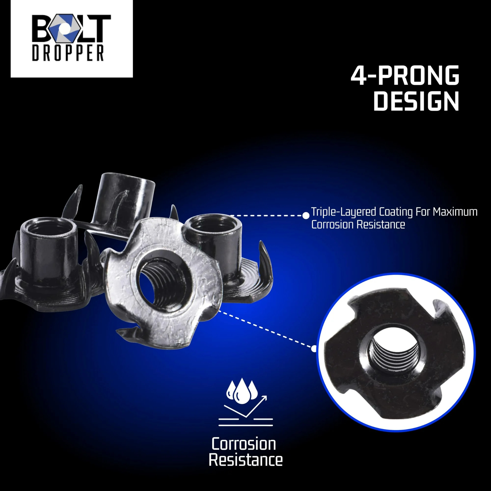 Bolt Dropper T-Nuts – Stainless Steel 4 Prong Nut – Sturdy 38-16 Thread Insert for Wood – Perfect for DIY, Woodworking and Construction – Great for Indoor and Outdoor – Set of 100 – Black Zinc