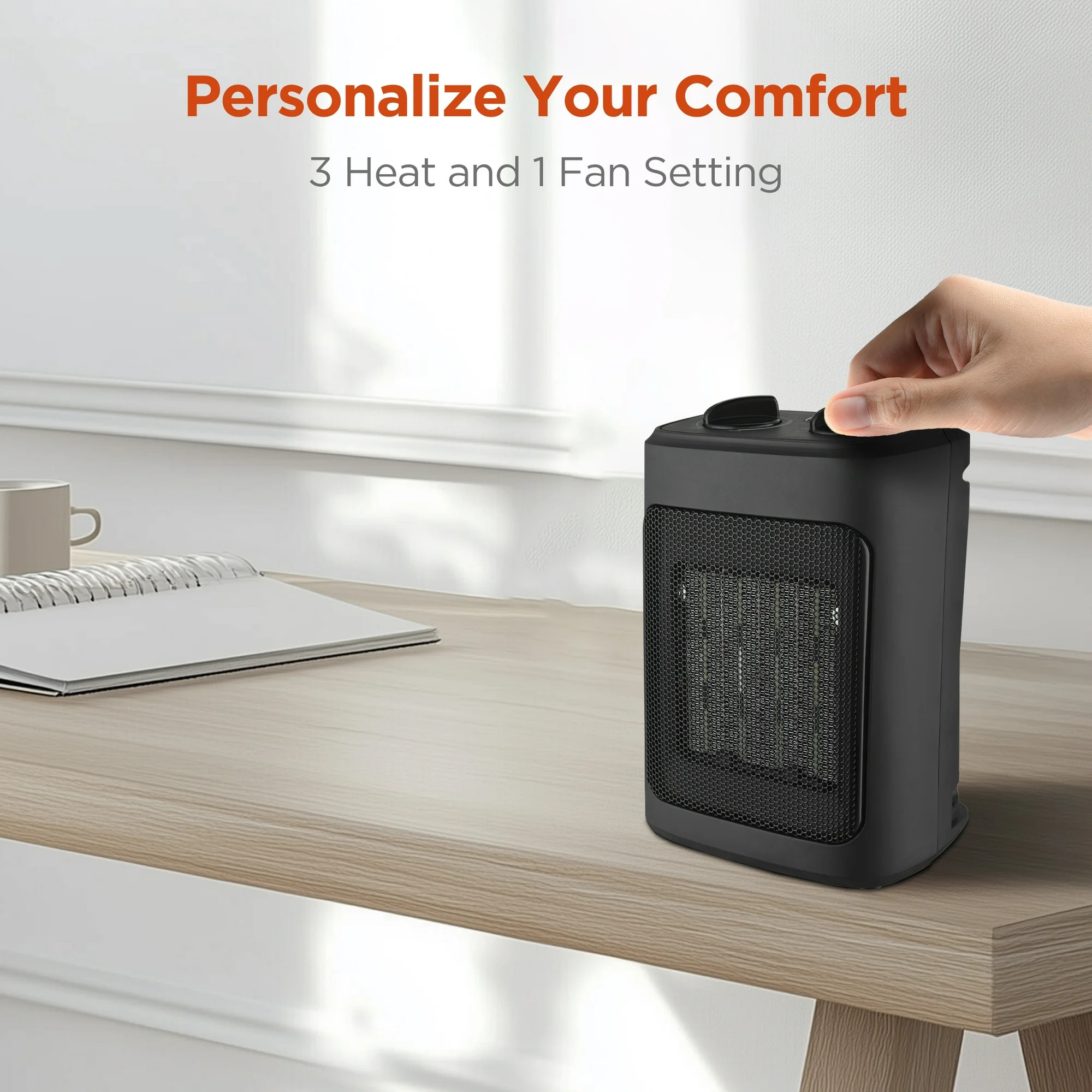 - Powerful Heating: Mainstays 1500W Ceramic Fan-Force Electric Space Heater with three heat settings: 700W, 900W, and 1500W.