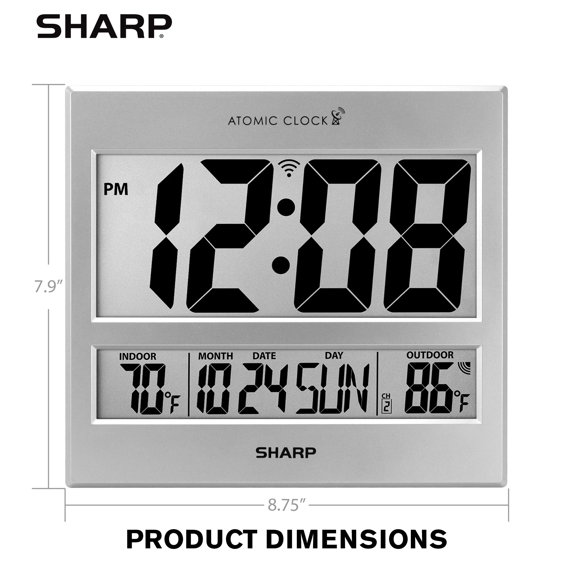 Sharp Atomic Clock – Jumbo 3″ Easy to Read Numbers – Never Needs Setting! – Indoor/ Outdoor Temperature Display with Wireless Outdoor Sensor – Silver
