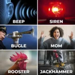 - 6 EXTREMELY Loud Wake up Sounds – Adjust the volume and tone of the six different unique sounds that will get you out of the bed and ready to start your day! Choose from Rooster, Bugle, Nagging Mom, Jackhammer, Siren, Loud Beep – Up to 115db Alarm Volume